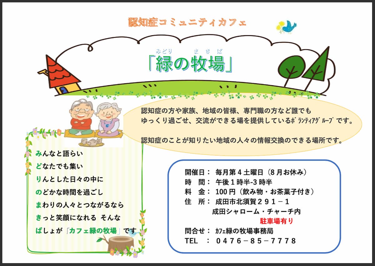 | 認知症コミュニティカフェ 「緑の牧場」 | 第4土曜日 13:30〜15:30 (8月休み | 認知症の方と家族や、地域の皆様、専門職の方など、 だれでもゆっくり過ごせ、交流できる場所を提供しています。 |